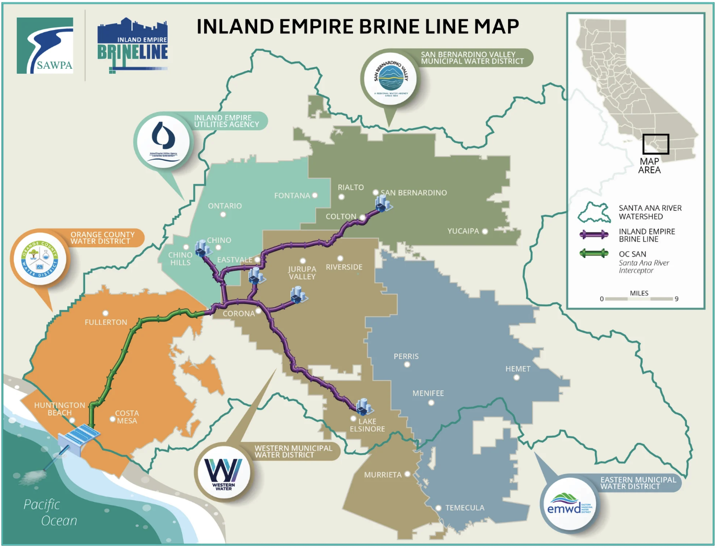 The Santa Ana River Watershed Project Authority (SAWPA), which consists of five water agencies located throughout the watershed including San Bernardino Valley, purchased capacity in the Brine Line to fund its construction and support long-term water quality protection.
